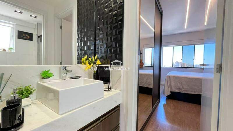 Banho da suíte com bancada em granito, armário, espelho e box em blindex