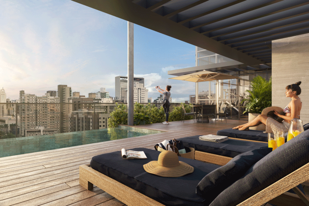 Rooftop com piscina com deck e sauna — ideal para lazer e relaxamento.