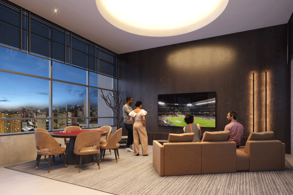 Área de lazer com espaço gourmet / lounge / sports bar, proporcionando ambientes de convívio.