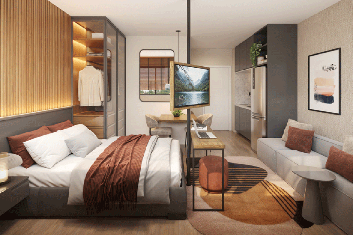 O empreendimento está planejado com studios / unidades compactas de 1 quarto, com metragens aproximadas entre 25 m² e 30 m².