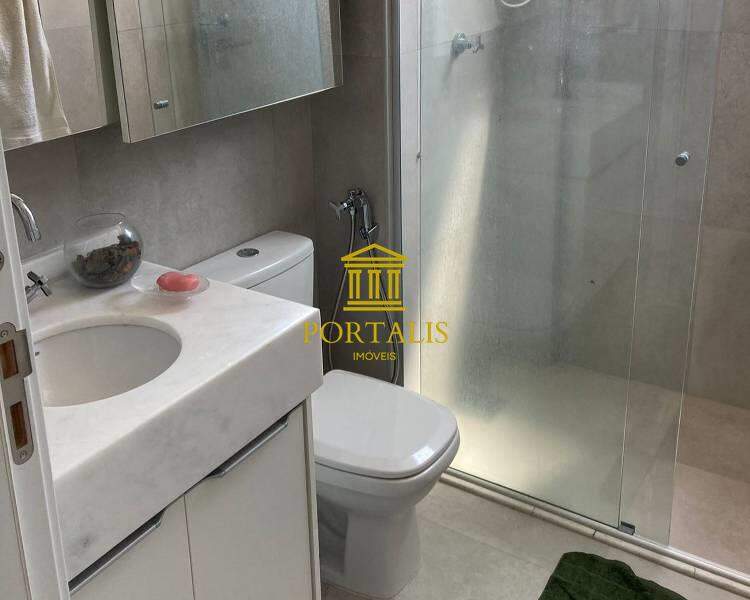 Banheiro social com bancada em granito, espelho, armários planejados e box em blindex