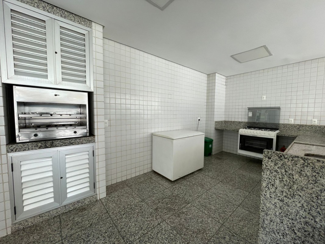 Apartamento com área de 130m², sala ampla para 02 ambientes, com piso em mármore claro polido, teto com rebaixamento em gesso e iluminação planejada, lavabo com bancada em granito e espelho, 04 quartos amplos (foi transformado em 03), todos com piso em taco de madeira e armários, sendo 01 suíte com bancada em granito, espelho, armários planejados, banheira e box em blindex, banheiro social com bancada em granito, espelho, armários planejados e box em blindex, cozinha ampla e funcional, com piso em granito preto polido, armários planejados em acabamento branco e bancada em granito, área de serviço com tanque e armários, DCE.
