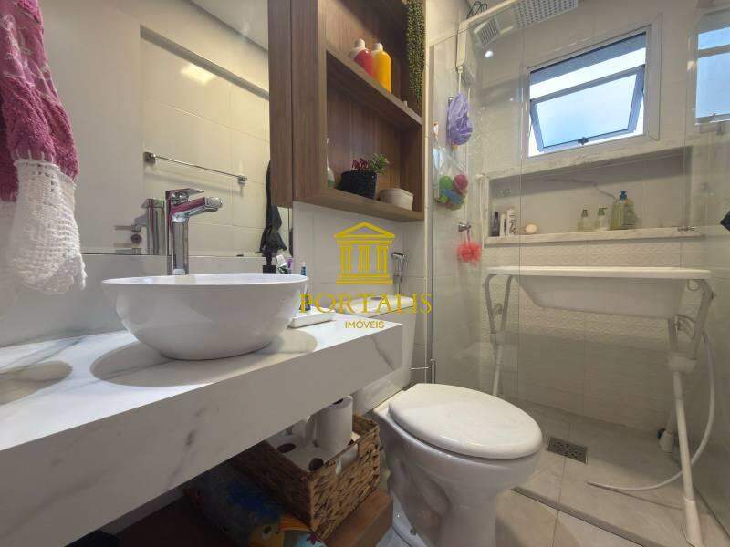 * Banheiro social com bancada em granito, pia em cuba, espelho, armários e box em blindex;