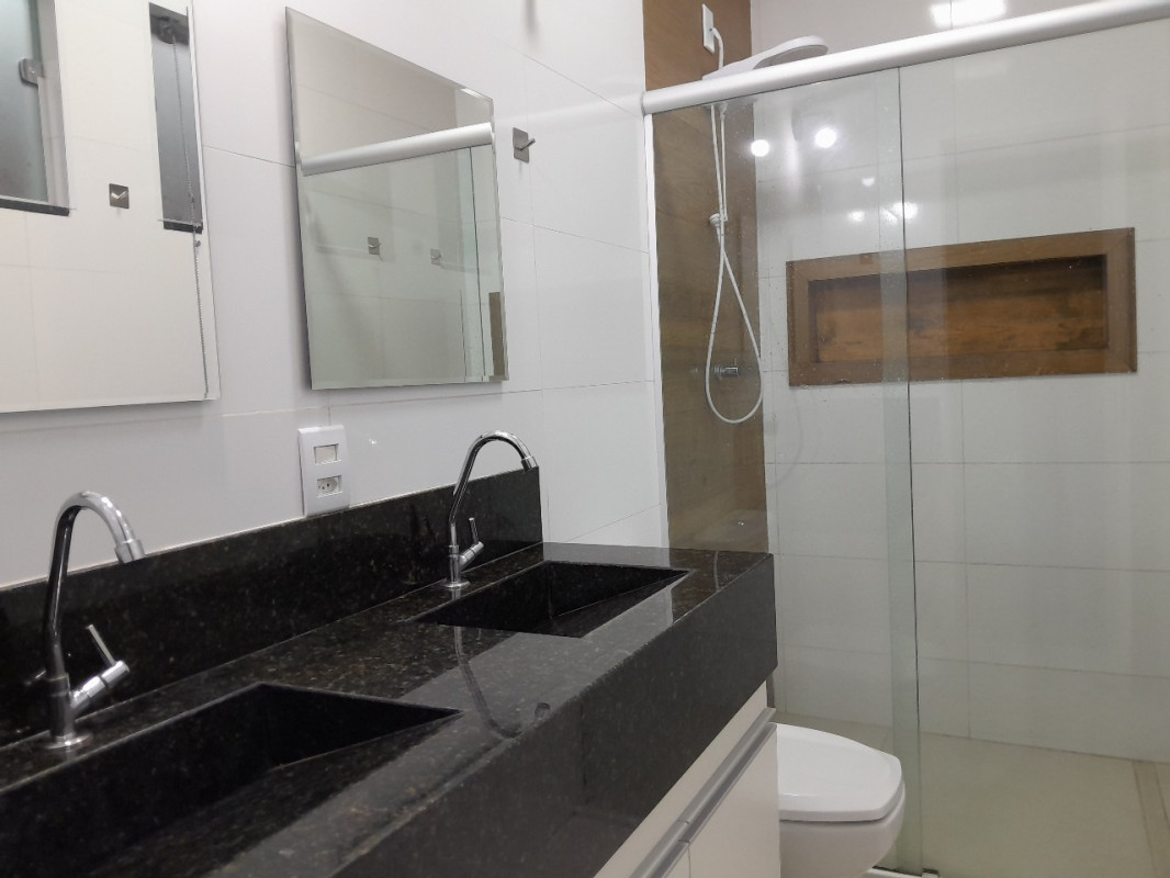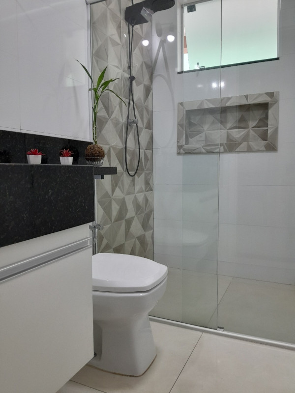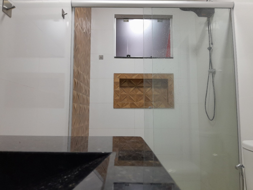 Banheiro Social: Banheiro social com armários, box em vidro temperado e piso em porcelanato.